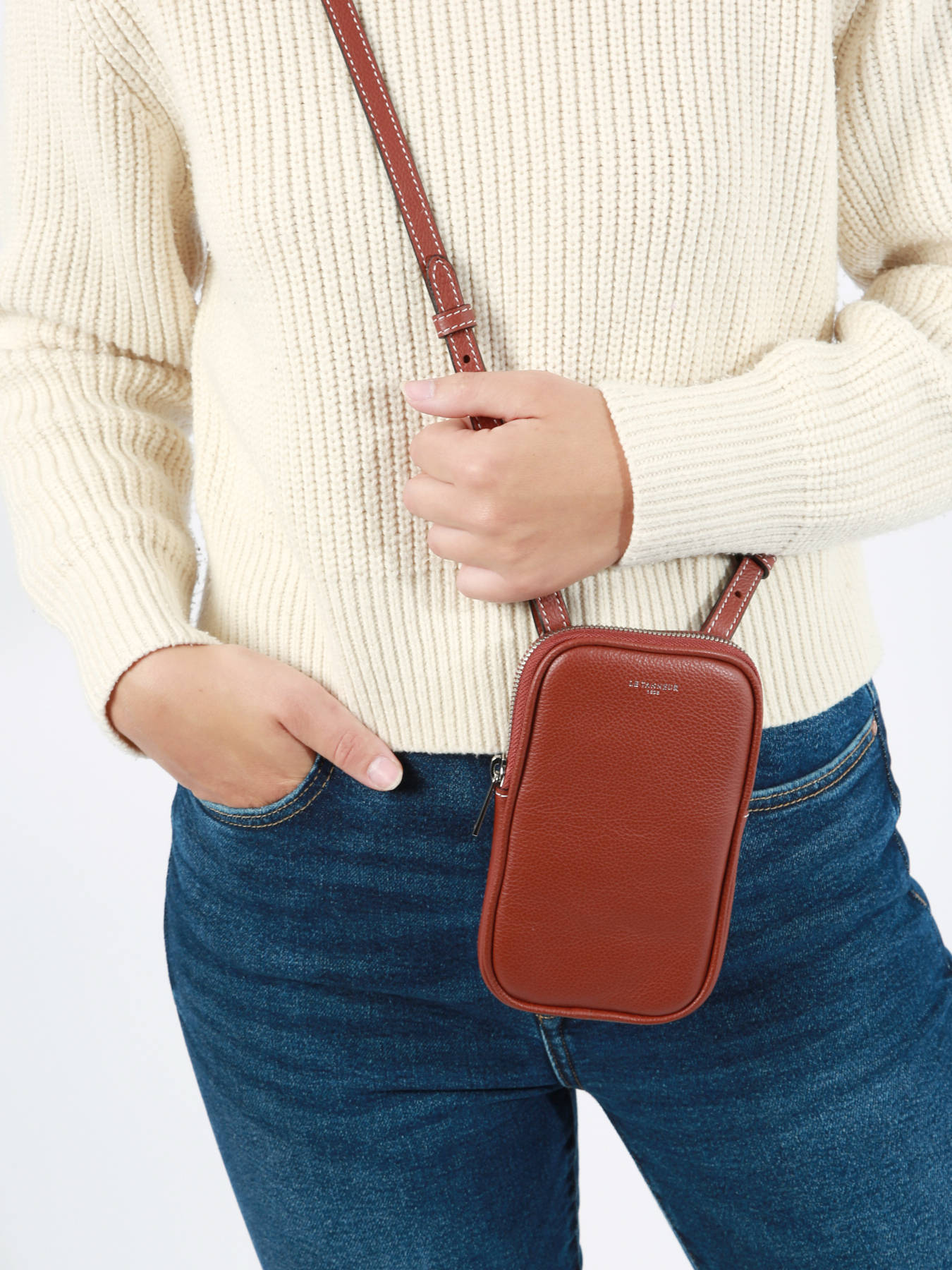 Le Tanneur's cowhide leather phone case is the perfect accessory to combine protection and elegance. Carefully crafted, it features a zip closure to ensure the security of your phone while adding a touch of sophistication. The shoulder strap, also made of cowhide leather, offers the convenience of carrying the case with ease. Inside, a simple pocket is ideal for your phone, ensuring a perfect fit. Additionally, three card slots add extra functionality, allowing you to travel light with your essentials. The high-quality cowhide leather ensures the durability of this case while adding a luxurious texture. With Le Tanneur's discreet logo, this phone case embodies the perfect blend of style, practicality, and craftsmanship.