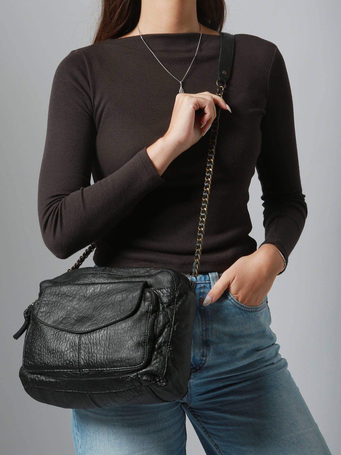 With its high quality leather and authentic design, this shoulder bag by Pièces is the perfect accessory for you. It can be worn on the shoulder or crossed over thanks to its adjustable leather chain shoulder strap, making it irresistible. From the Naina line, this casual style essential has one compartment, two single pockets and two zip pockets. Wear it every day with a classic outfit.
