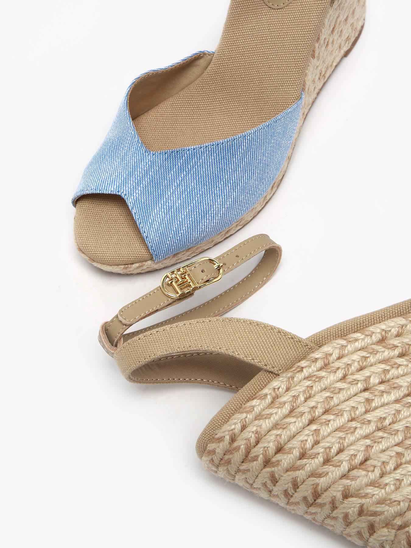 Ces sandales espadrilles compensées en chambray de TOMMY HILFIGER sont idéales pour les journées ensoleillées. Conçues avec une tige en chambray de coton, elles offrent une texture légère et respirante pour un confort optimal. Le talon compensé assure une silhouette élancée tout en offrant une stabilité et un soutien parfaits. La semelle intermédiaire recouverte de jute et la semelle extérieure en caoutchouc thermoplastique apportent une touche naturelle et une adhérence fiable. La bride à la cheville, avec sa fermeture à boucle et la boucle plate en forme de monogramme TH, ajoute une touche de raffinement. Disponibles dans le coloris blue spell, ces sandales espadrilles se marient facilement avec vos tenues estivales tout en affirmant un style moderne et emblématique grâce au branding TOMMY HILFIGER.