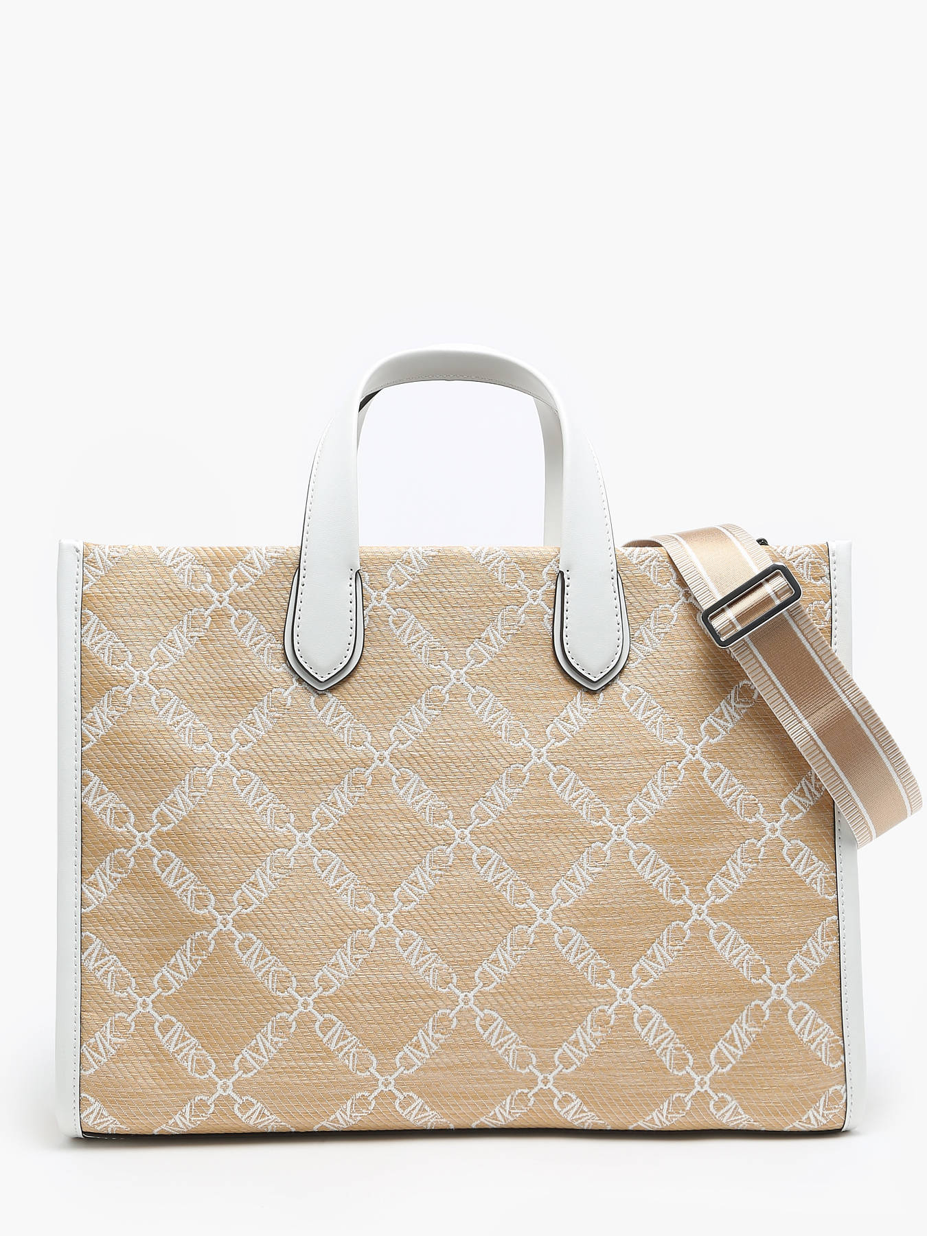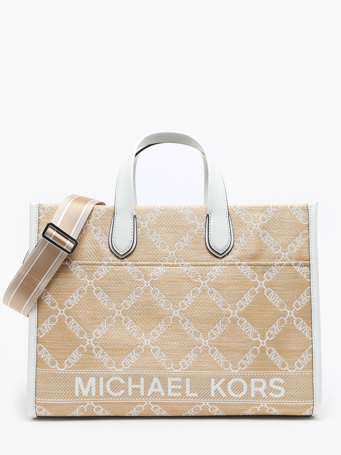 The MICHAEL KORS handbag embodies elegance and practicality with its design of raffia trimmed with leather. Featuring a front pocket, two simple pockets, and one zippered pocket, this bag offers optimal organization for your daily essentials. Its 10 cm handle height allows for a comfortable grip, while the adjustable and removable shoulder strap provides additional versatility, allowing you to carry it by hand or over the shoulder according to your preferences. The zippered closure ensures the security of your personal belongings, adding peace of mind during your travels. With a spacious compartment, this bag enables you to keep your belongings well organized. Whether for a busy workday or a city getaway, this MICHAEL KORS handbag is the perfect companion to complement your outfit with style and functionality.
