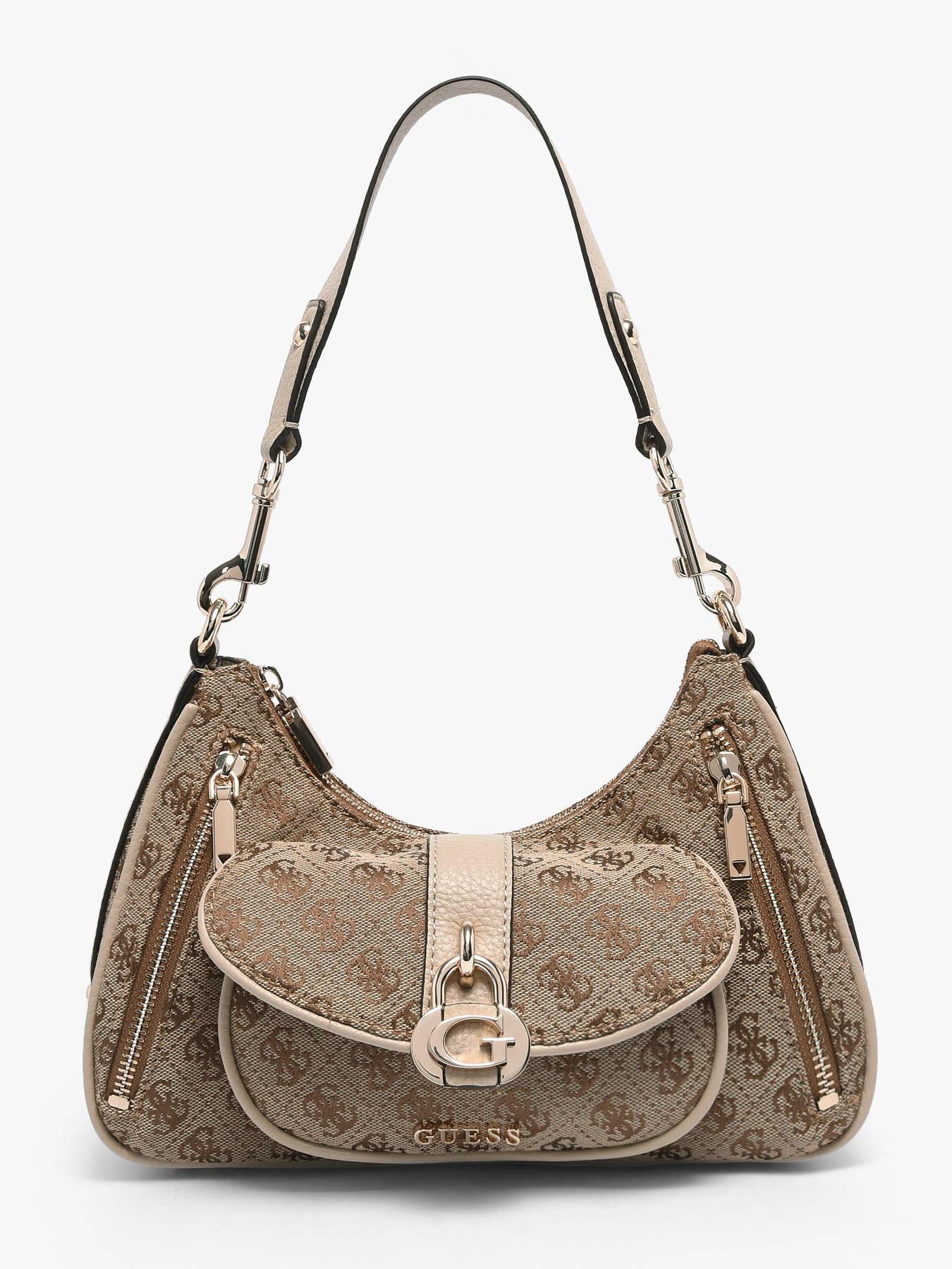 The JESSA GUESS shoulder bag, made of polyester, combines modern style with everyday functionality. Its practical exterior features three front pockets, a back pocket, and a secure zip closure, while the 27 cm handle ensures comfortable shoulder wear. Inside, a main compartment, a zip pocket, and three card slots provide organized storage for essentials such as your phone, wallet, or small accessories, ensuring accessibility and order. Lightweight, durable, and stylish, this JESSA GUESS bag stands out for its contemporary design and refined details, adding a chic and practical touch to any outfit. Perfect for those seeking a functional and stylish bag, it is an essential accessory for daily use.