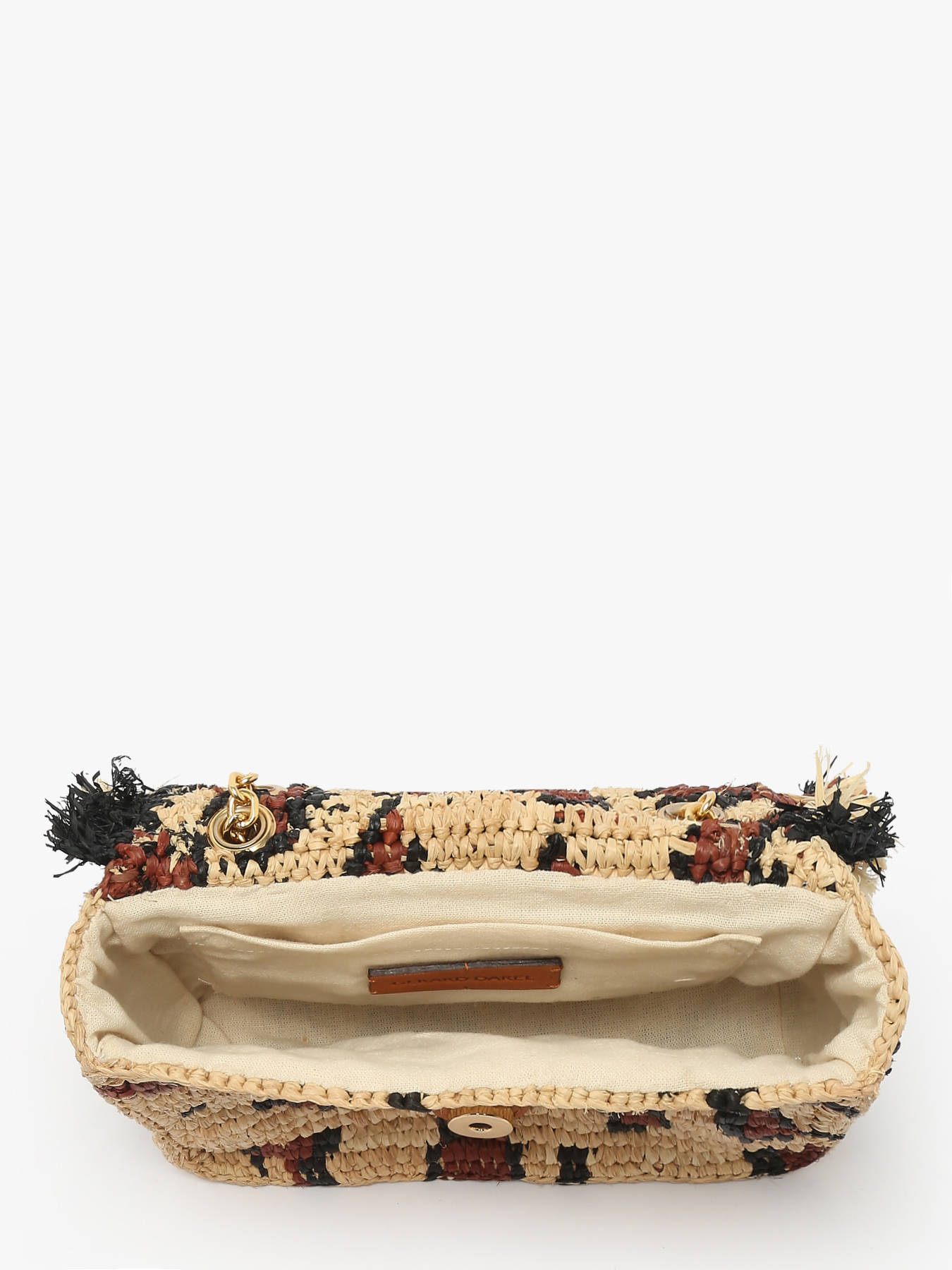 The GERARD DAREL shoulder bag, made from raffia and leather accents, combines elegance with functionality. It closes with a flap and magnetic closure for practical and secure use. This model can be worn on the shoulder or across the body, depending on your preference. Inside, a single pocket and compartment help keep your essentials well organized. This bag is perfect for a casual yet refined everyday look.