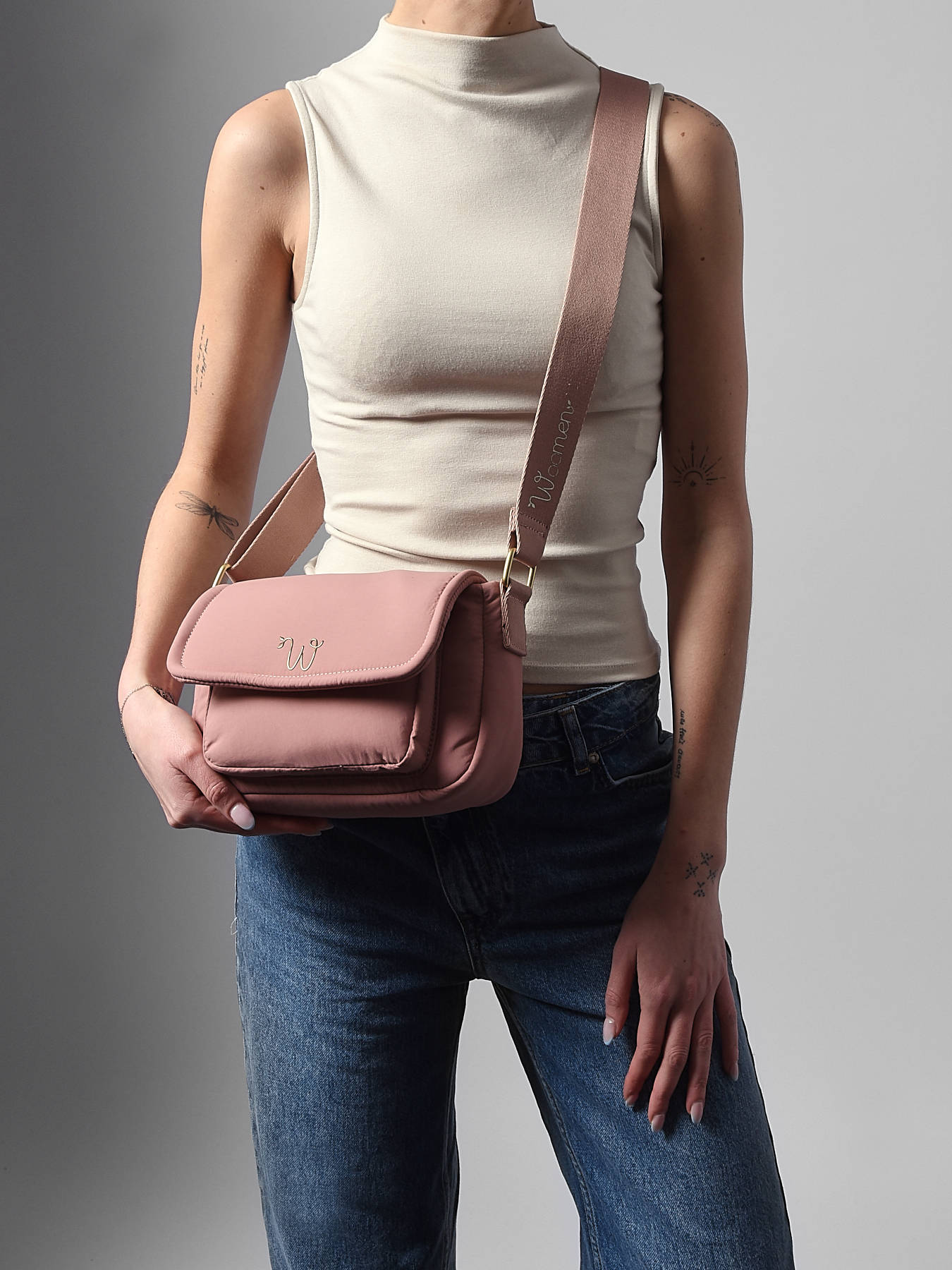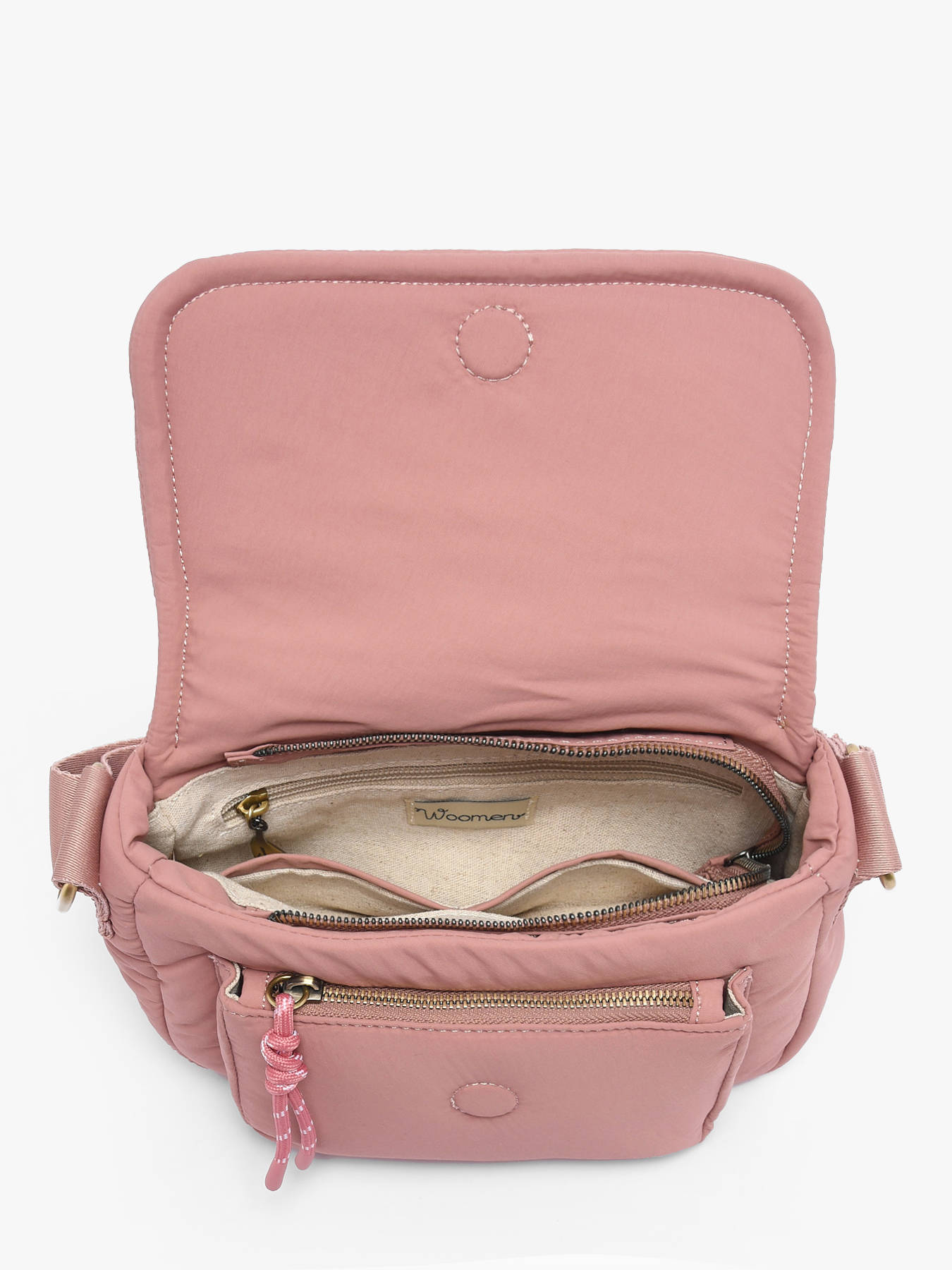 The WOOMEN crossbody bag from the PRIMEVERE line, in a small format, captivates with its magnetic flap, secure zip closures, and multiple pockets, including zipped compartments at the front and back. Made from recycled nylon, it features an adjustable strap for crossbody wear and a cotton and linen-lined interior with two slip pockets, a zipped pocket, and a single main compartment. The golden resin logo and decorative cords add a refined touch.