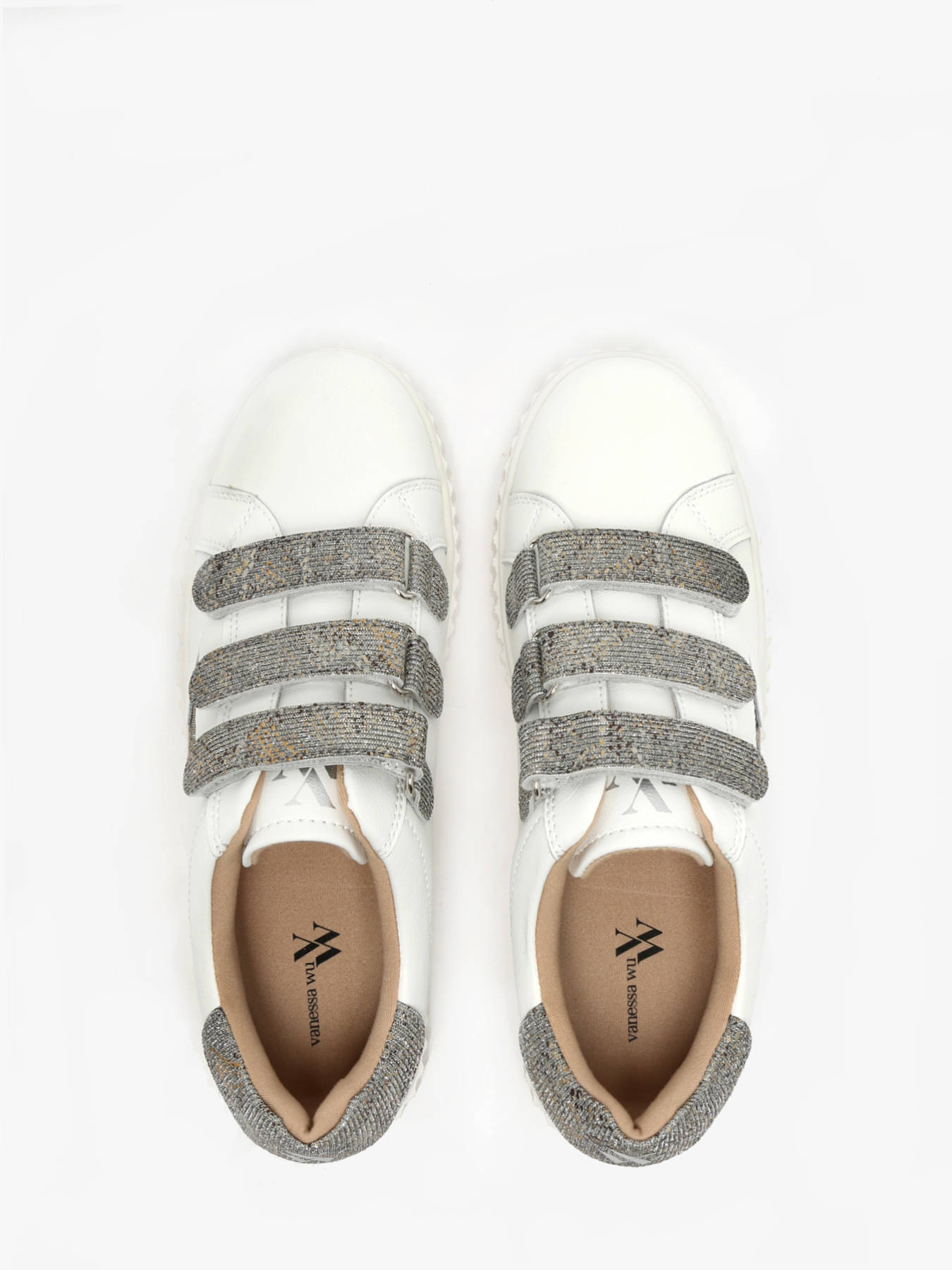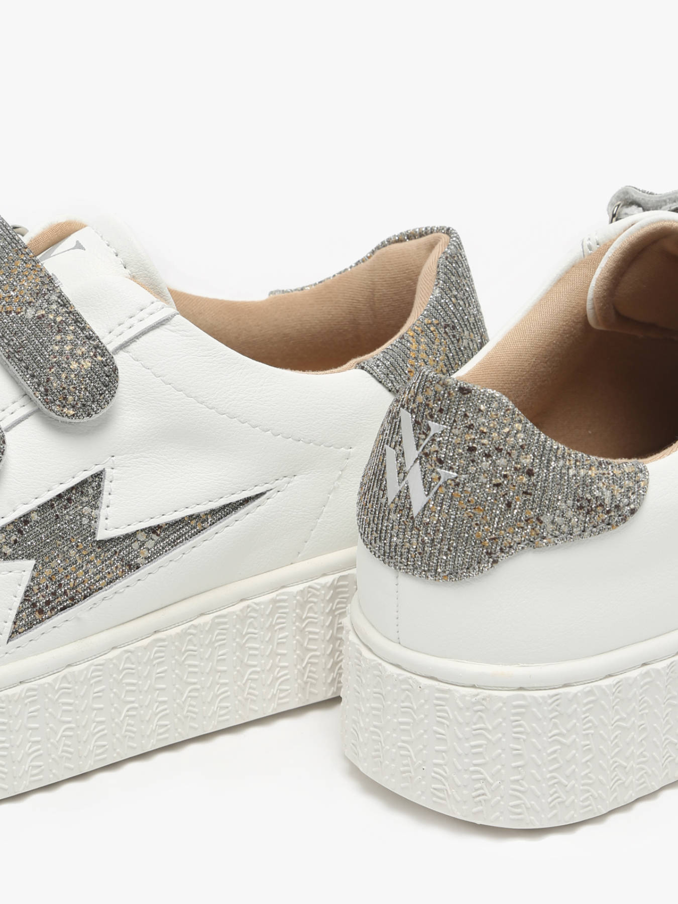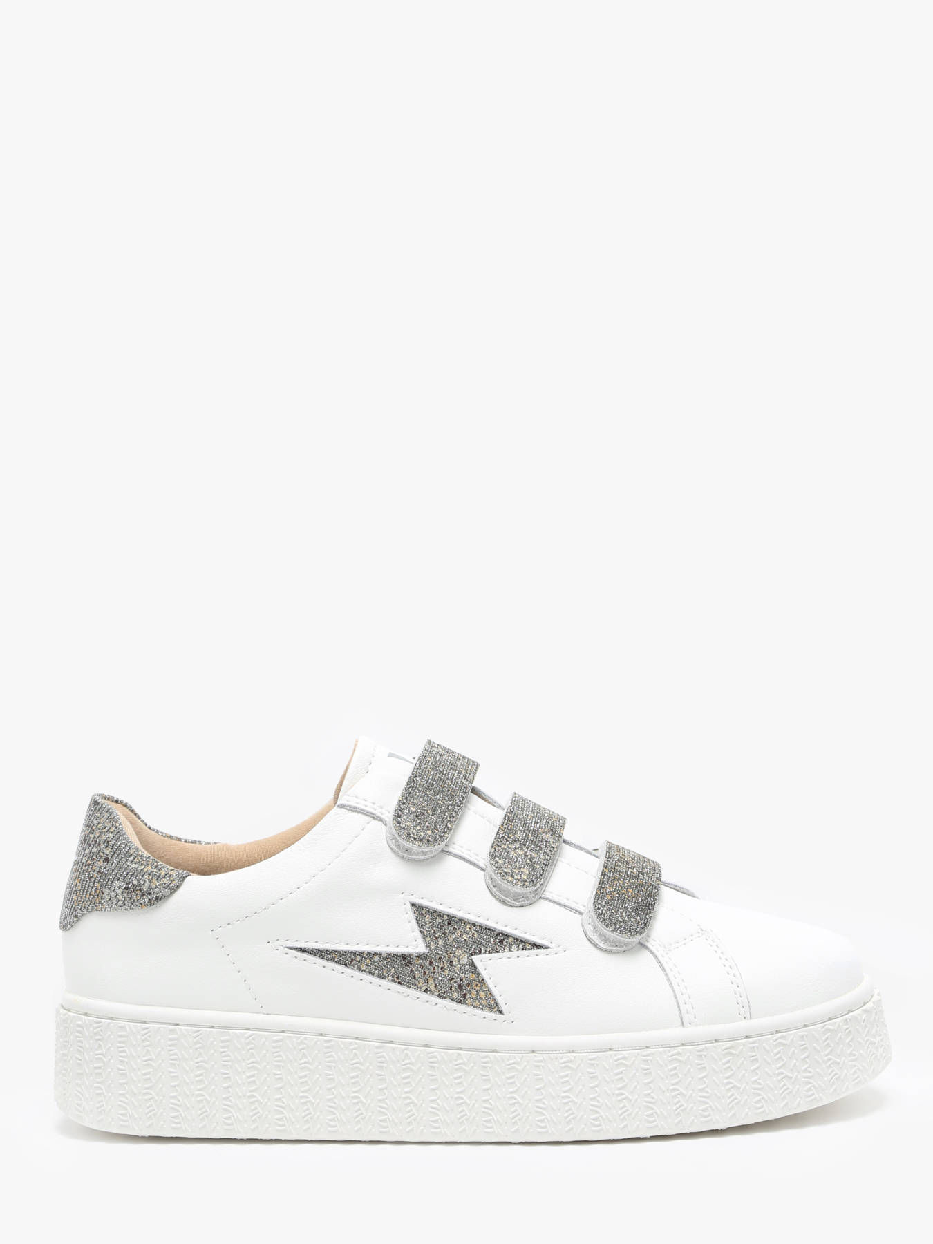 Les baskets éclair Jane blanches en cuir à scratchs anthracite de Vanessa Wu incarnent l’élégance et le confort. Avec leur cuir blanc, elles sont sublimées par une découpe en forme d’éclair et des détails métallisés. Le patch arrière anthracite, agrémenté de fils argentés et d’un imprimé tacheté or, argent et bronze, apporte une touche sophistiquée. La fermeture à scratchs assure une praticité moderne, tandis que le bout rond et la semelle creepers blanche offrent un confort optimal. Parfaites pour un look chic et décontracté, ces baskets se distinguent par leur design raffiné et polyvalent.