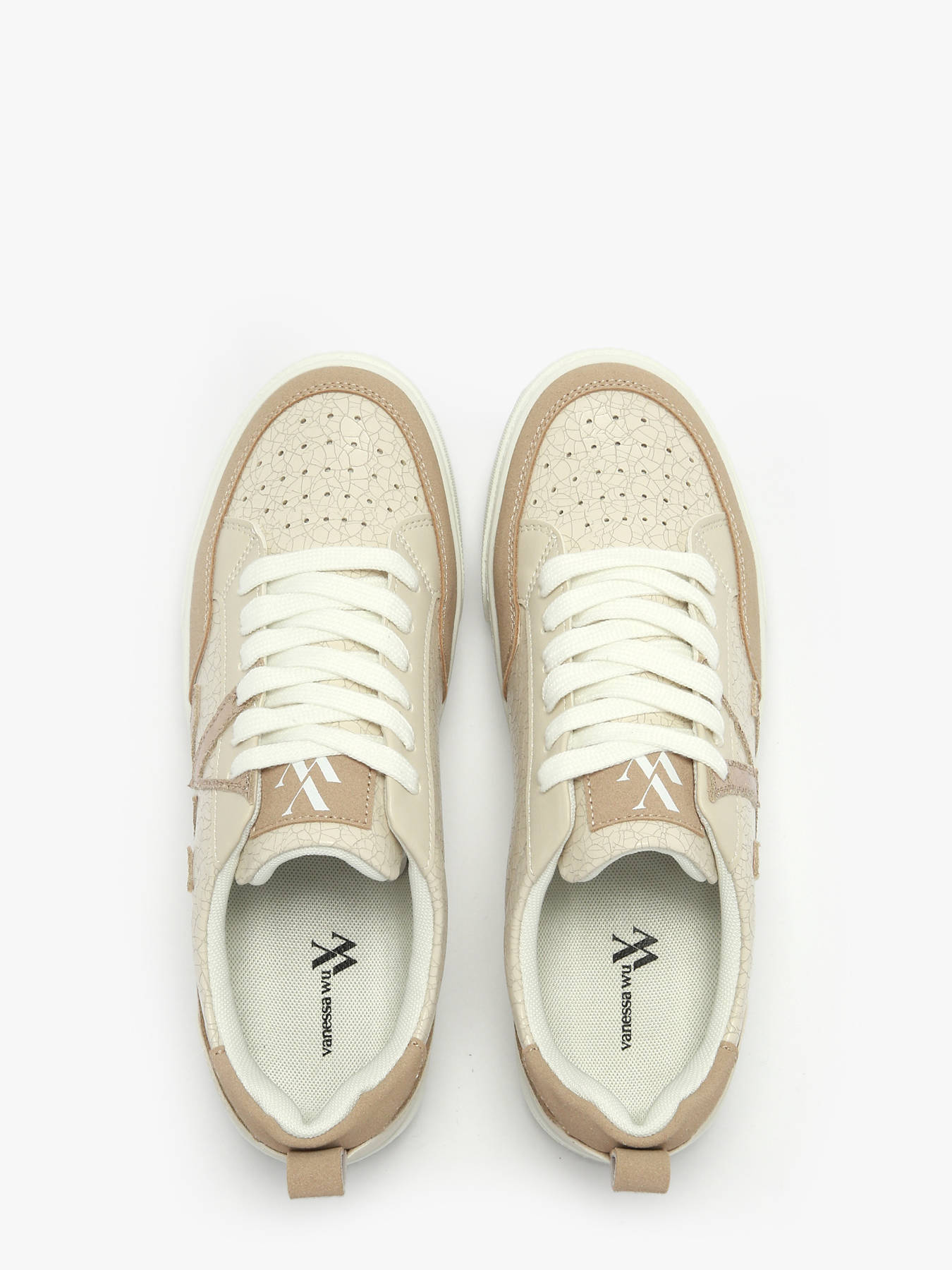 Fall in love with the Joyce monogram sneakers by Vanessa Wu, the perfect mix of style, comfort and modern elegance. Made in white faux leather with a textured gold monogram, suede toe and panel, and a perforated upper, they bring originality and sophistication to any outfit. The white lace-up closure, massaging microbead insole and textured white sole provide all-day comfort and support. This model fits true to size, take your usual size or go up for half sizes. Perfect for a chic yet casual look, these sneakers are a must-have from Vanessa Wu’s new collection.
