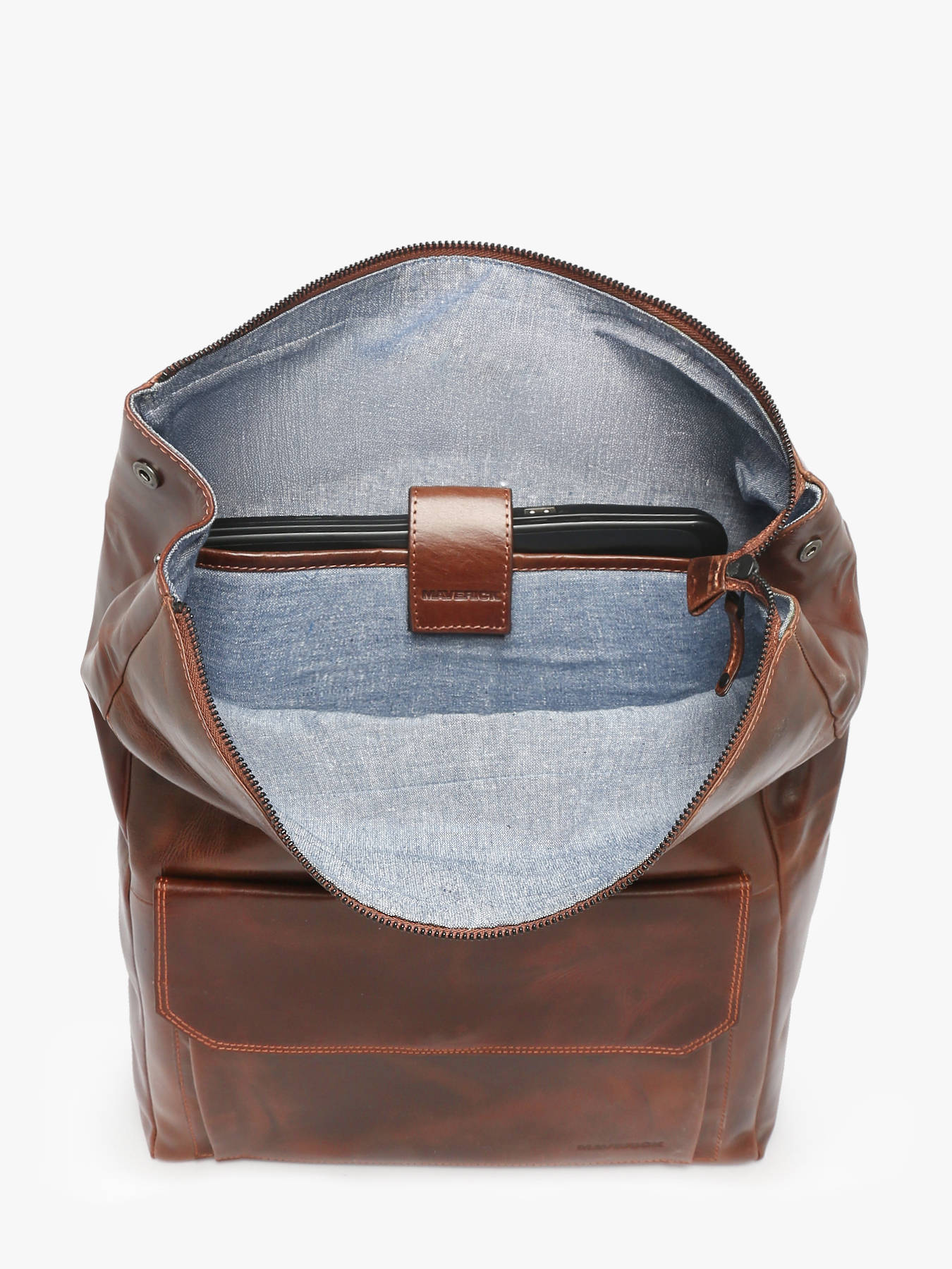 The MAVERICK business backpack in buffalo leather combines elegance and efficiency for your workdays. Its structured design includes a front and a back pocket for quick access to essentials. Inside, it features one open pocket, one zip pocket, a dedicated pen holder, and a padded compartment for laptops up to 15.6"". Adjustable straps offer optimal comfort, while the rear trolley sleeve allows for easy attachment to rolling luggage. Ideal for professionals on the go.